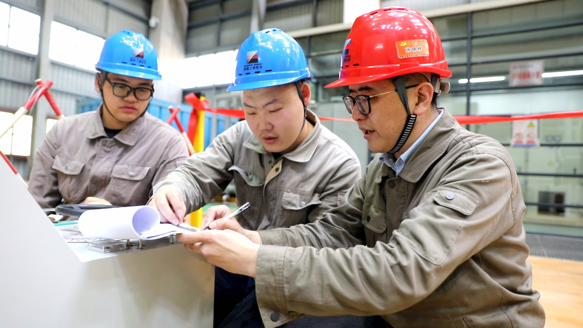 檢修人員多方協作吊裝轉子。 王洋 提供