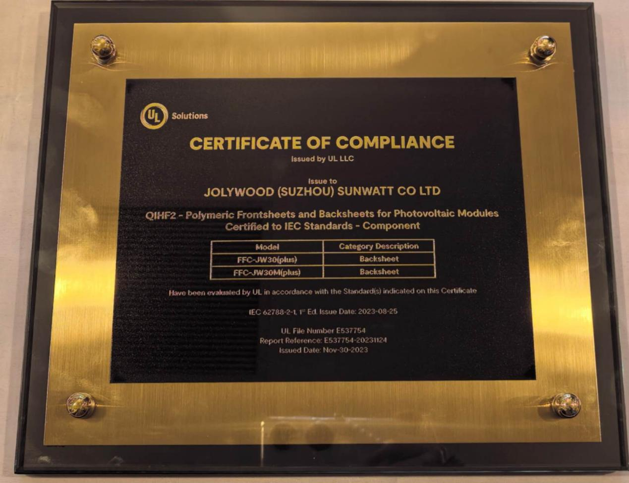 中來(lái)新材在美榮獲權(quán)威機(jī)構(gòu)頒發(fā)光伏組件用背板證書(shū)