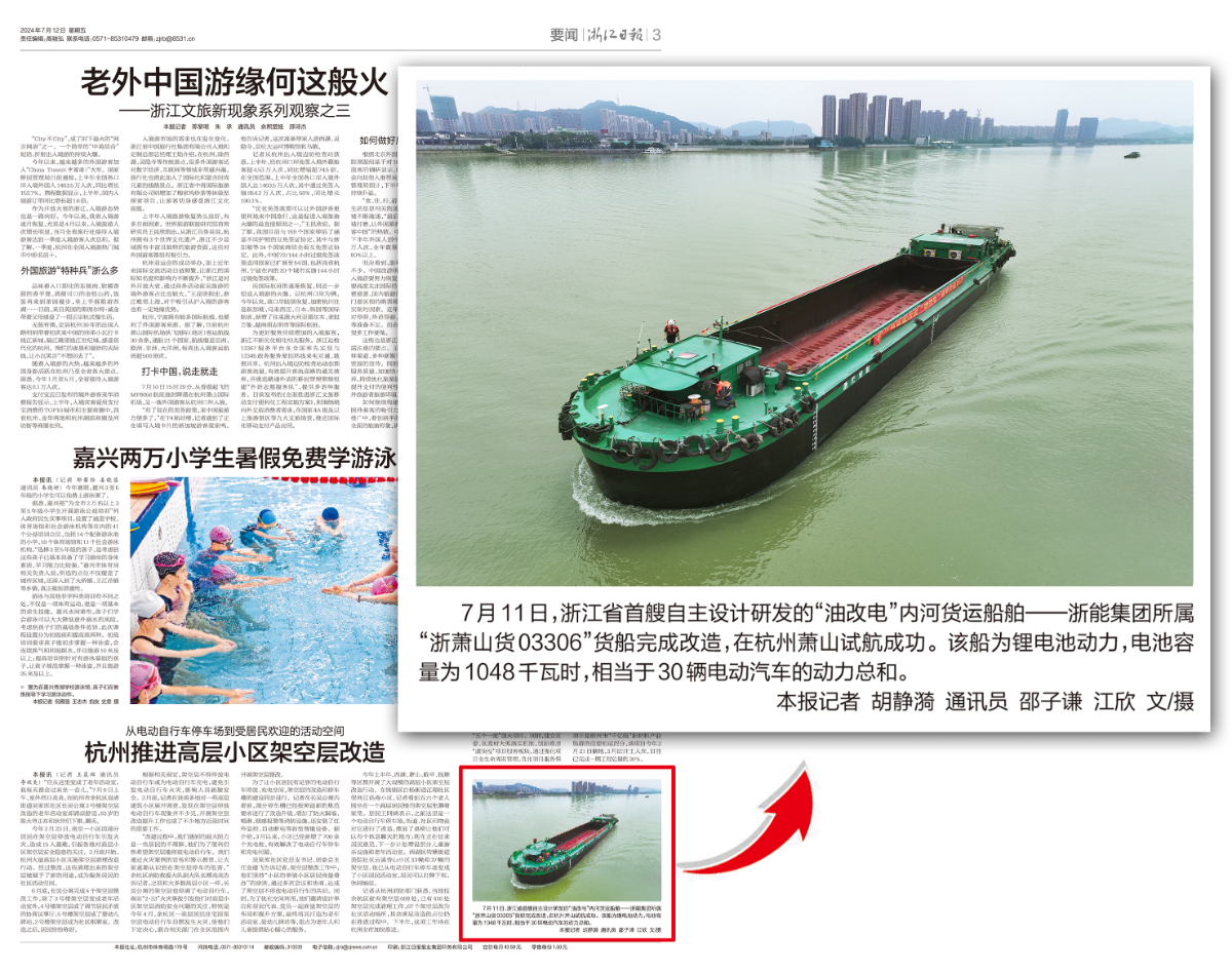 7月11日,潮新聞客戶端報道《浙江首艘!浙能自主研發“油改電”內河貨船試航成功》。 潮新聞客戶端 圖