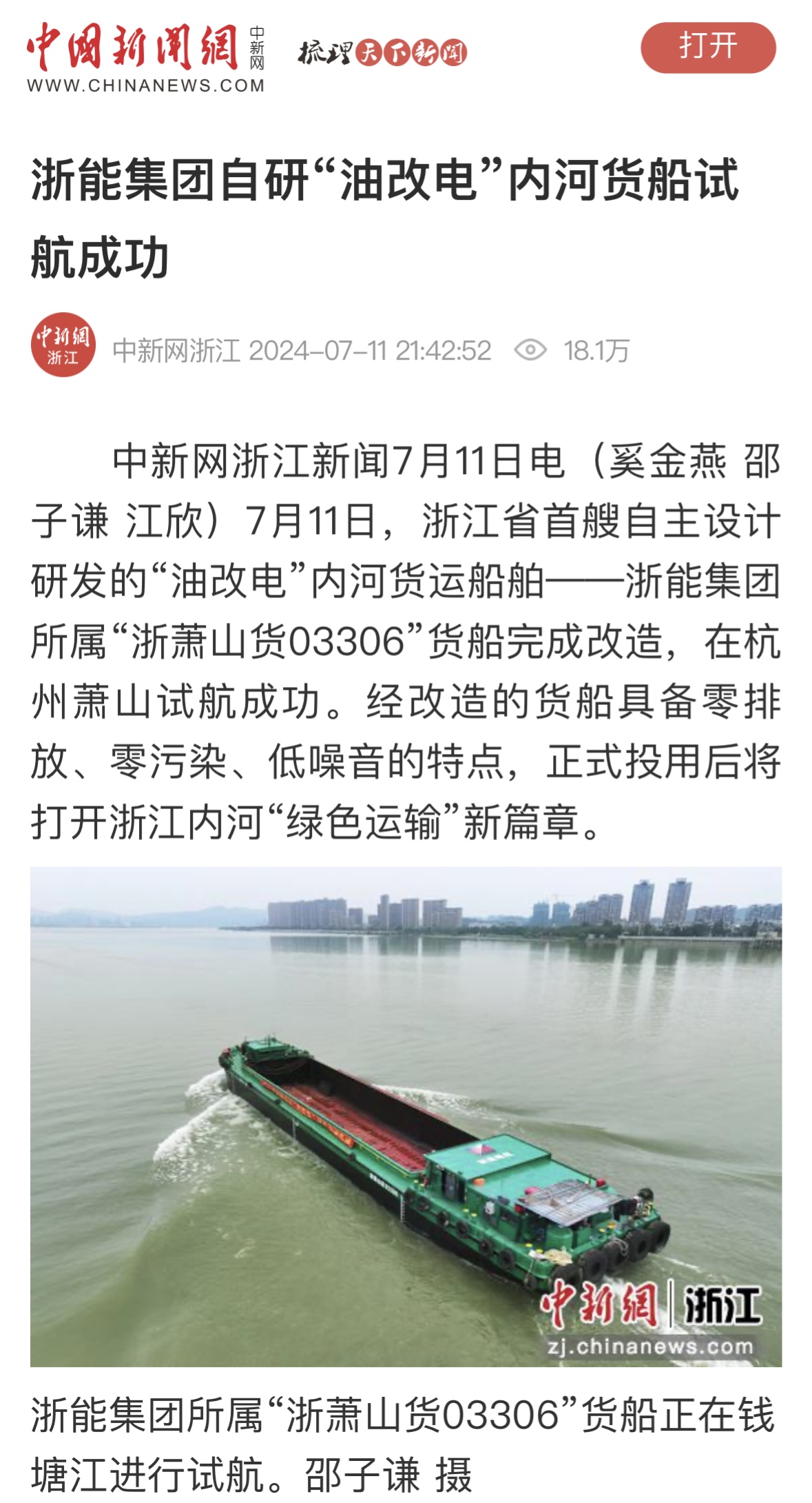 7月11日,中國新聞網報道《浙能集團自研“油改電”內河貨船試航成功》。 中國新聞網 圖