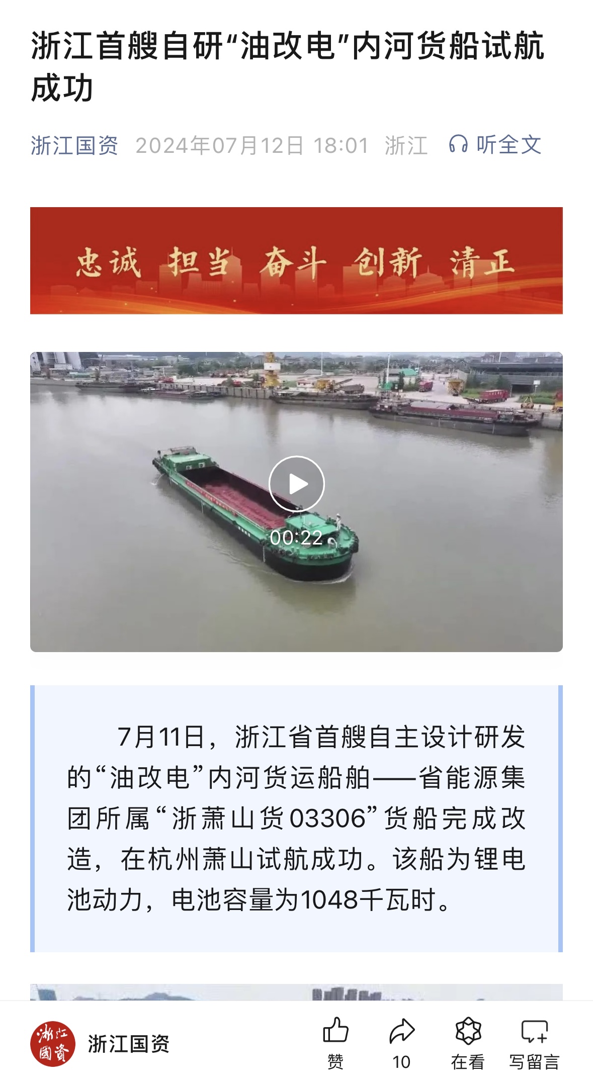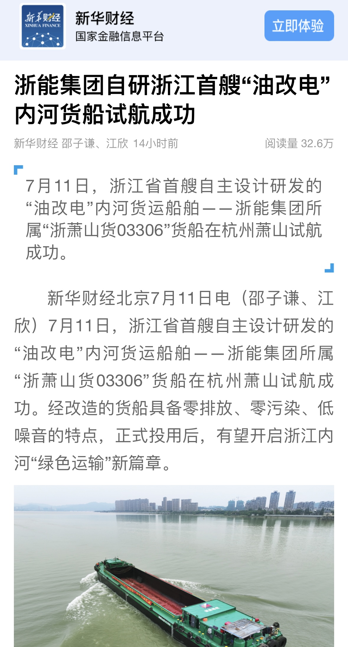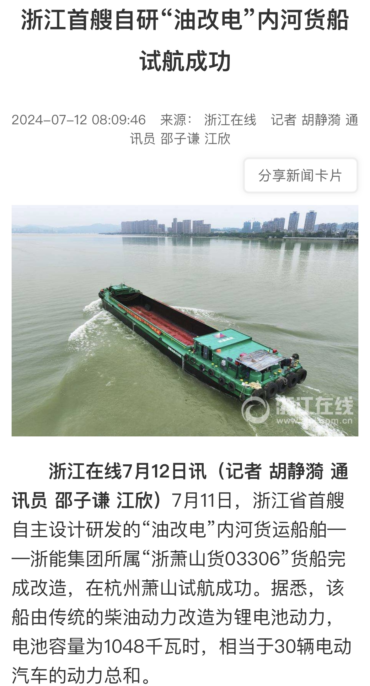 7月12日,浙江在線公眾號報道《浙能集團自研“油改電”內河貨船試航成功》。 浙江在線 圖
