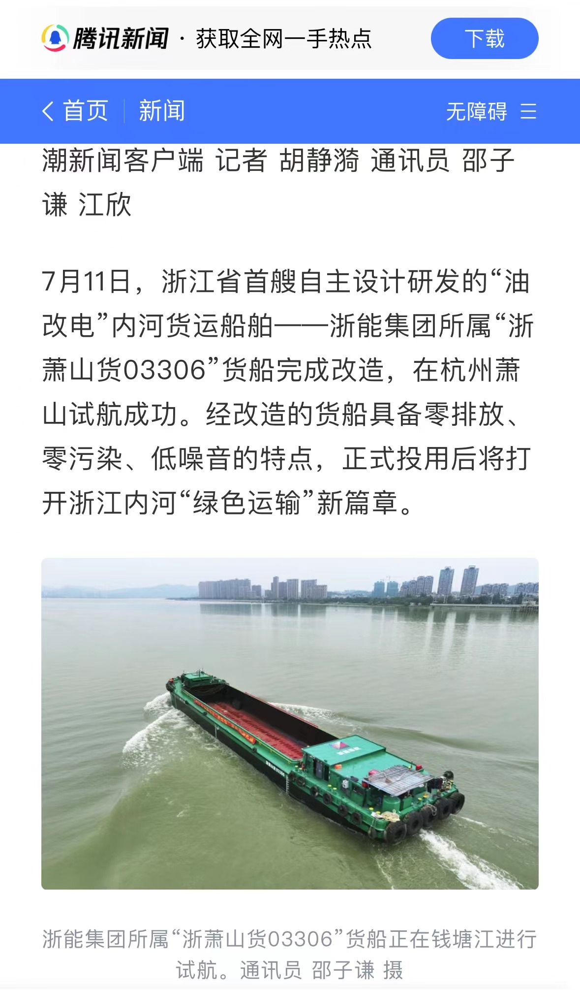 7月11日,騰訊新聞報道《浙能集團自研“油改電”內河貨船試航成功》。 騰訊新聞 圖