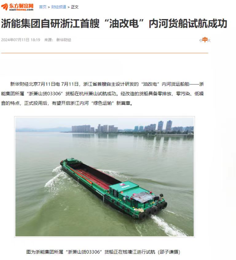 7月12日,中國能源網報道《浙能集團自研“油改電”內河貨船試航成功》。 中國能源網 圖