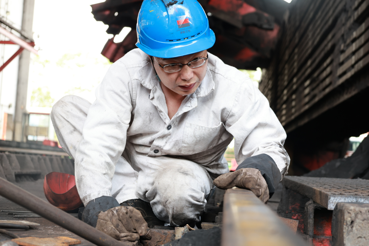 “撬棍再壓下來點,再加一塊墊片試試。”在蘭溪發電公司翻車機房,陣陣熱浪撲面而來,身著白色焊工服的褚建華剛到現場便急著俯身趴在翻車機活動軌道上反復查看,不一會身上、帽子上便蹭上了許多煤粉,臉上的汗水“嗒嗒”地滴落在滾燙的鐵軌上迅速蒸發,他的眼睛卻只是直直地盯著軌道,不停地對軌道高度做著調整,拆解螺栓、撬動軌道、電焊加固……一套操作下來,他已俯身在地一個多小時了,終于趕在煤車翻卸前完成了任務。他說,“熱點、累點都在其次,外面煤車這么多,我們可不能掉鏈子。在關鍵時期,設備安穩了,我們心里才踏實。”